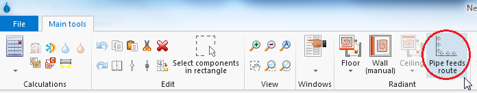 Editing of pipe feeds may be automated to a high degree. Die Route der Anbindeleitungen is a component inserted by the user into the project to connect Heizen/Kühl Zone type components with component Doppelverteiler. Based on the arrangement and settings of Die Route der Anbindeleitungen components, when performing calculations the program automatically generates a set of components of the Anschlussleitung type, taking into account the number of connected Heizkreis components. That number is the result of dividing Heizen/Kühl Zone into loops, which may be either done automatically or specified by the user. Anschlussleitung may also be edited manually.